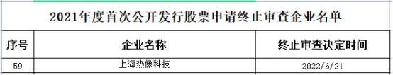 據(jù)證監(jiān)會(huì)官網(wǎng)消息,上海熱像科技位列2021年度首次公開發(fā)行股票申請終止審查企業(yè)名單,終止審查決定時(shí)間為2022年6月21日。