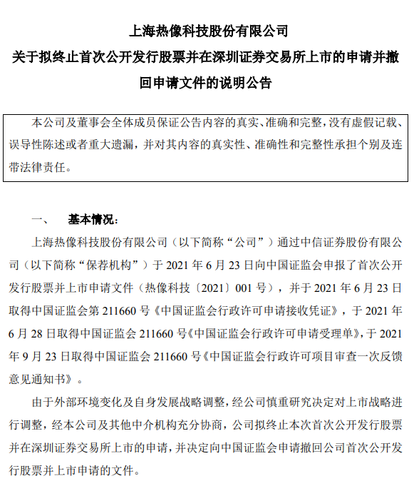 6月6日,熱像科技發(fā)布《關(guān)于擬終止首次公開發(fā)行股票并在深圳證券交易所上市的申請并撤回申請文件的說明公告》。公告內(nèi)容顯示,熱像科技計(jì)劃終止首次公開發(fā)行股票并在深交所上市的申請,并決定向中國證監(jiān)會(huì)申請撤回公司首次公開發(fā)行股票并上市申請的文件,原因是外部環(huán)境變化及自身發(fā)展戰(zhàn)略調(diào)整,公司慎重研究決定對上市戰(zhàn)略進(jìn)行調(diào)整。