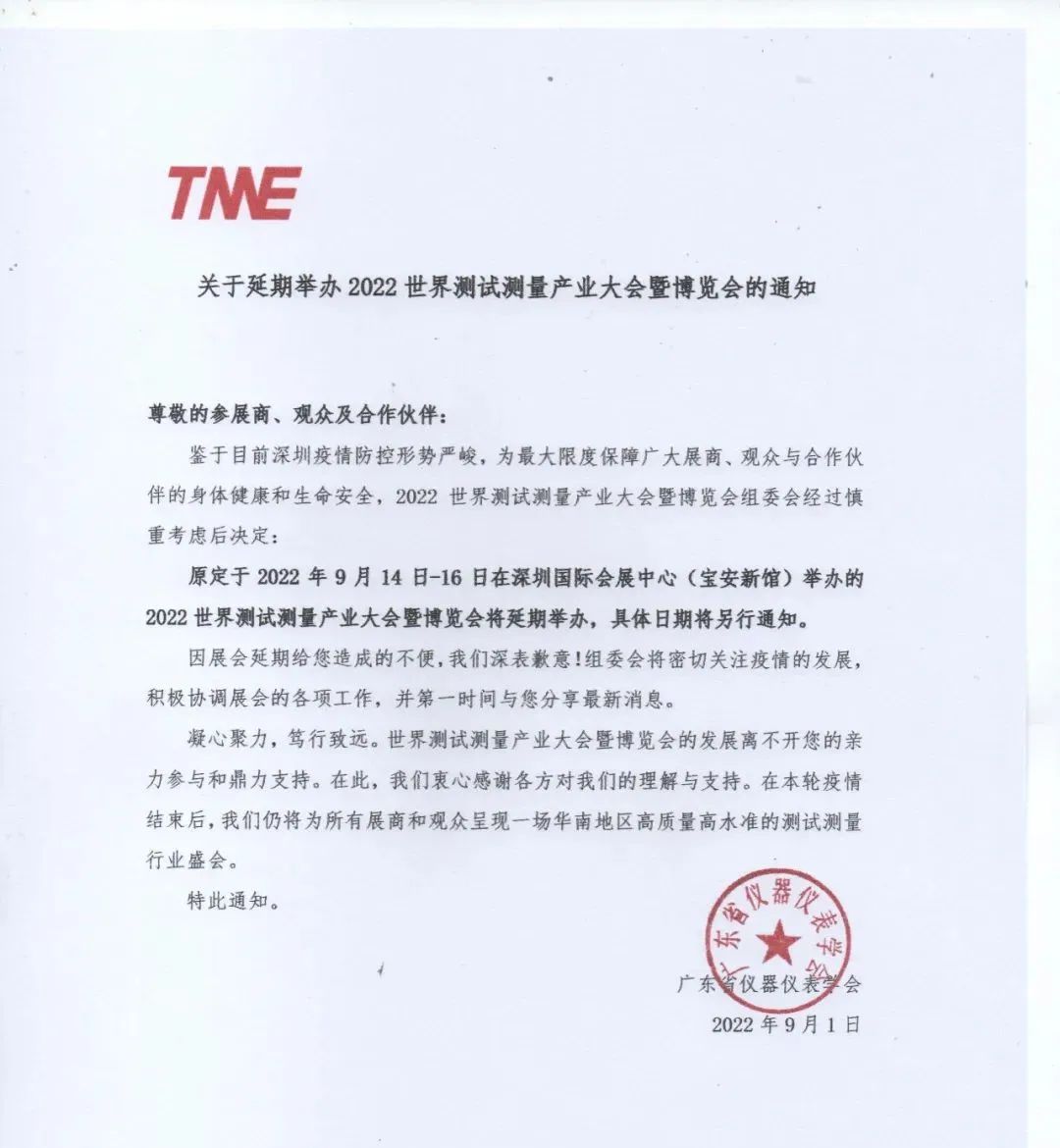 鑒于目前深圳疫情防控形勢(shì)嚴(yán)峻,為最大限度保障廣大展商、觀眾與合作伙伴的身體健康和生命安全,2022世界測(cè)試測(cè)量產(chǎn)業(yè)大會(huì)暨博覽會(huì)組委會(huì)經(jīng)過(guò)慎重考慮后決定: