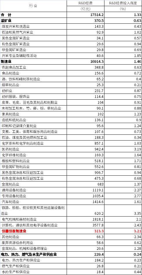 從行業(yè)來看,儀器儀表制造業(yè)R&D經(jīng)費投入為313.3億元,投入強度為3.21%,強度在所有行業(yè)中位居第二,僅次于鐵路、船舶、航空航天和其他運輸設備制造業(yè)的3.35%,各行業(yè)平均投入強度為1.33%。