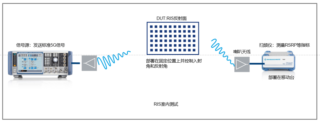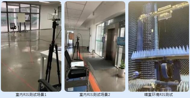 RIS驗證環(huán)境分為室內(nèi)測試和室外測試,室內(nèi)測試主要包括:RIS被測件以及測試儀表。RIS被測件采用專業(yè)RIS設(shè)備供應(yīng)商行晟科技的RIS產(chǎn)品,其中Sub-6G的RIS陣面尺寸為860mm*860mm,陣元為2020,毫米波的RIS陣面尺寸為180mm*180mm,陣元為32x32。測試儀表包括:用于發(fā)送不同頻段標(biāo)準(zhǔn)5G參考測試信號的SMW200A矢量信號源;用于測量RSRP等參數(shù)的TSME6掃頻儀。通過改變測試條件,驗證RIS超表面在不同條件下的性能指標(biāo)是否符合設(shè)計預(yù)期。