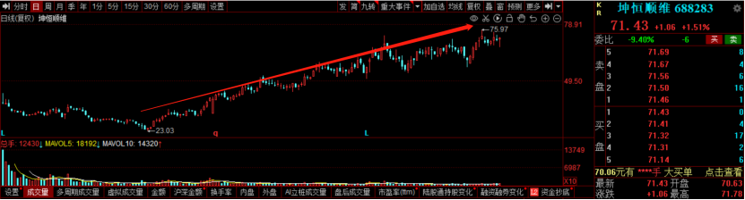 二級市場表現(xiàn)看,有1/3的營收來自包括高校和小客戶群體、市占率近50%的科學(xué)儀器細(xì)分龍頭坤恒順維股價近期創(chuàng)下歷史新高,自4月27日達(dá)到歷史低點后,迄今累計最大漲幅達(dá)229%。