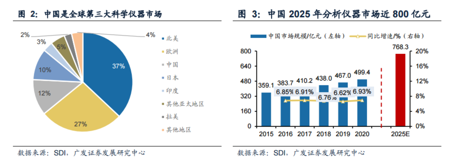 廣發(fā)證券郭鵬等在10月9日研報中表示,我國生命科學(xué)、食品安全等領(lǐng)域正處成長期,未來有望帶動相應(yīng)科學(xué)儀器的需求快速增長,預(yù)計2020-2025年國內(nèi)市場需求復(fù)合增速可近9%,2025年可達(dá)768億元,廣闊市場空間下亦有希望孕育國際龍頭。