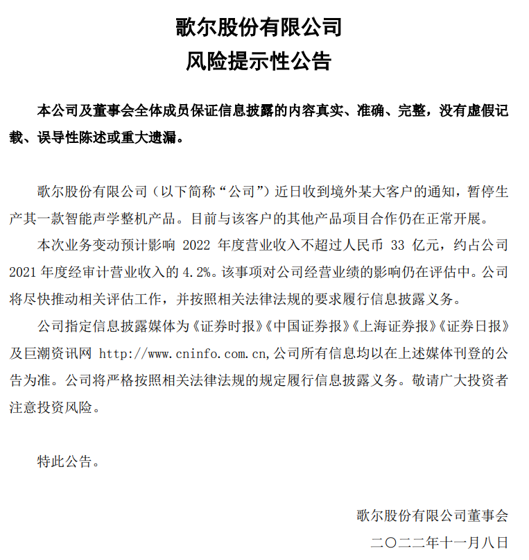 11月8日晚,中國最大的MEMS企業(yè)歌爾股份,突發(fā)風險提示性公告,稱“近日收到境外某大客戶的通知,暫停生產其一款智能聲學整機產品”。公告中稱,預計該業(yè)務損失的營收不超過33億元,約占歌爾股份2022年總營收的4.2%。