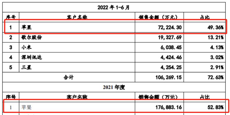據歌爾微的招股書顯示,營收數(shù)據穿透后,從2019到2022上半年,歌爾微向蘋果產業(yè)鏈公司的銷售金額占營業(yè)收入的比例分別為 47.76%、58.53%、56.37%和 52.04%??梢钥吹?,蘋果貢獻了歌爾微一半的營收!