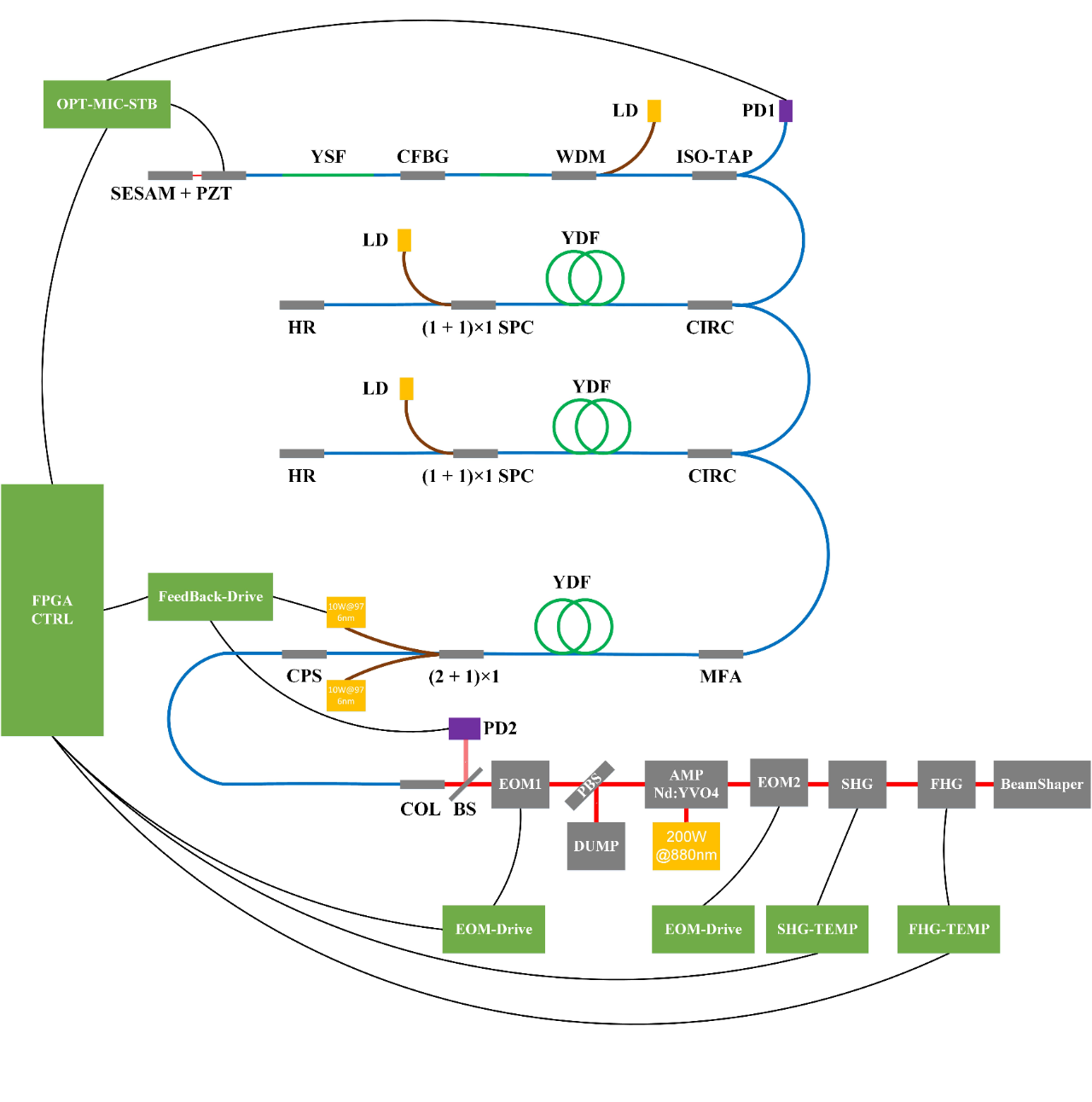 為了實(shí)現(xiàn)穩(wěn)定的脈沖輸出,光至科技基于自身在MOPA脈沖激光器上積累的電控技術(shù)積累,專門(mén)定制開(kāi)發(fā)了高穩(wěn)定性的電控系統(tǒng),包括基于FPGA的高速總控,低噪聲泵浦恒流驅(qū)動(dòng),高精度晶體溫控和高帶寬鎖頻閉環(huán)電子學(xué)。