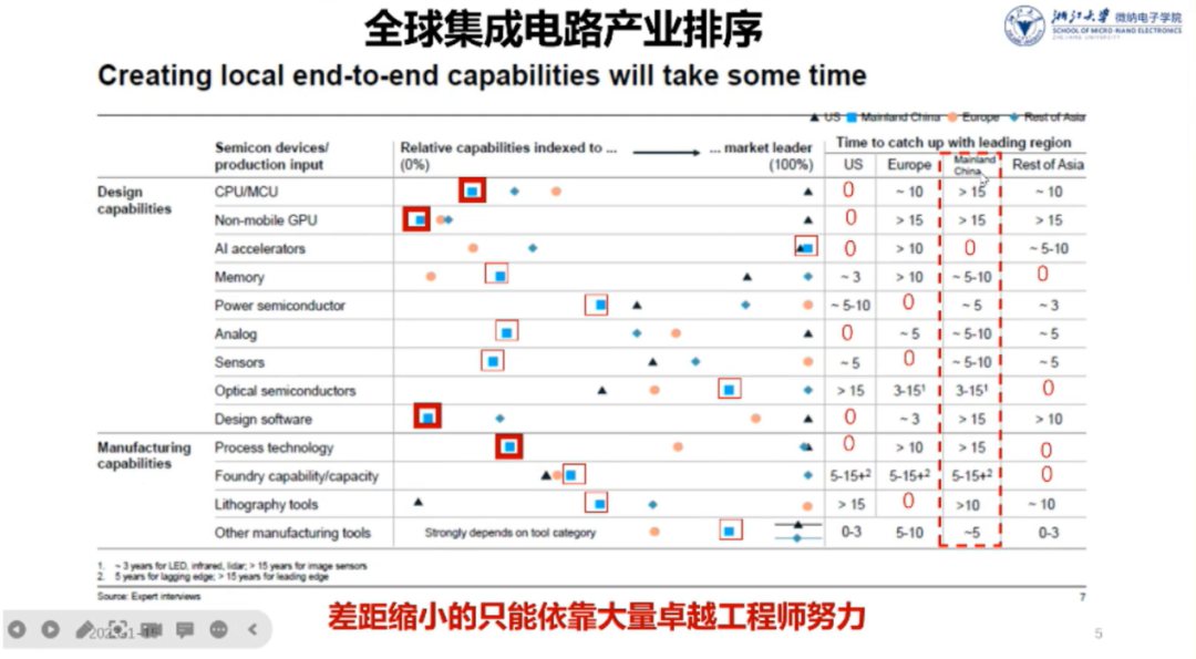 從上圖可以看到,我國(guó)集成電路在世界產(chǎn)業(yè)中的位置,以CPU為例,在世界舞臺(tái)上我國(guó)大概落后15年。令人吃驚的是,在眾多領(lǐng)域中,我國(guó)集成電路基本上是5-15年的差距。差距的縮小只能依靠大量卓越工程師的努力。