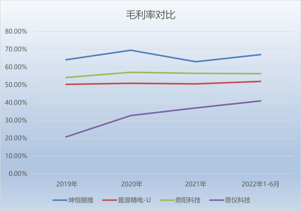 然而,對(duì)比各競(jìng)來看,思儀科技的毛利率還是略遜一籌。報(bào)告期內(nèi),坤恒順維的毛利率分別為64.16%、69.49%、63.01%、67.02%,普源精電分別為50.25%、50.92%、50.58%、51.98%,鼎陽科技分別為54.09%、57.07%、56.48%、56.28%。