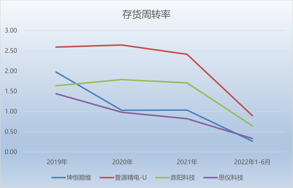對(duì)比各競(jìng)對(duì)來看,同期坤恒順維的存貨周轉(zhuǎn)率分別為1.97次、1.10次、1.12次、0.28次;普源精電分別為2.59次、2.64次、2.41次、0.90次;鼎陽科技分別為1.63次、1.79次、1.71次、0.64次。