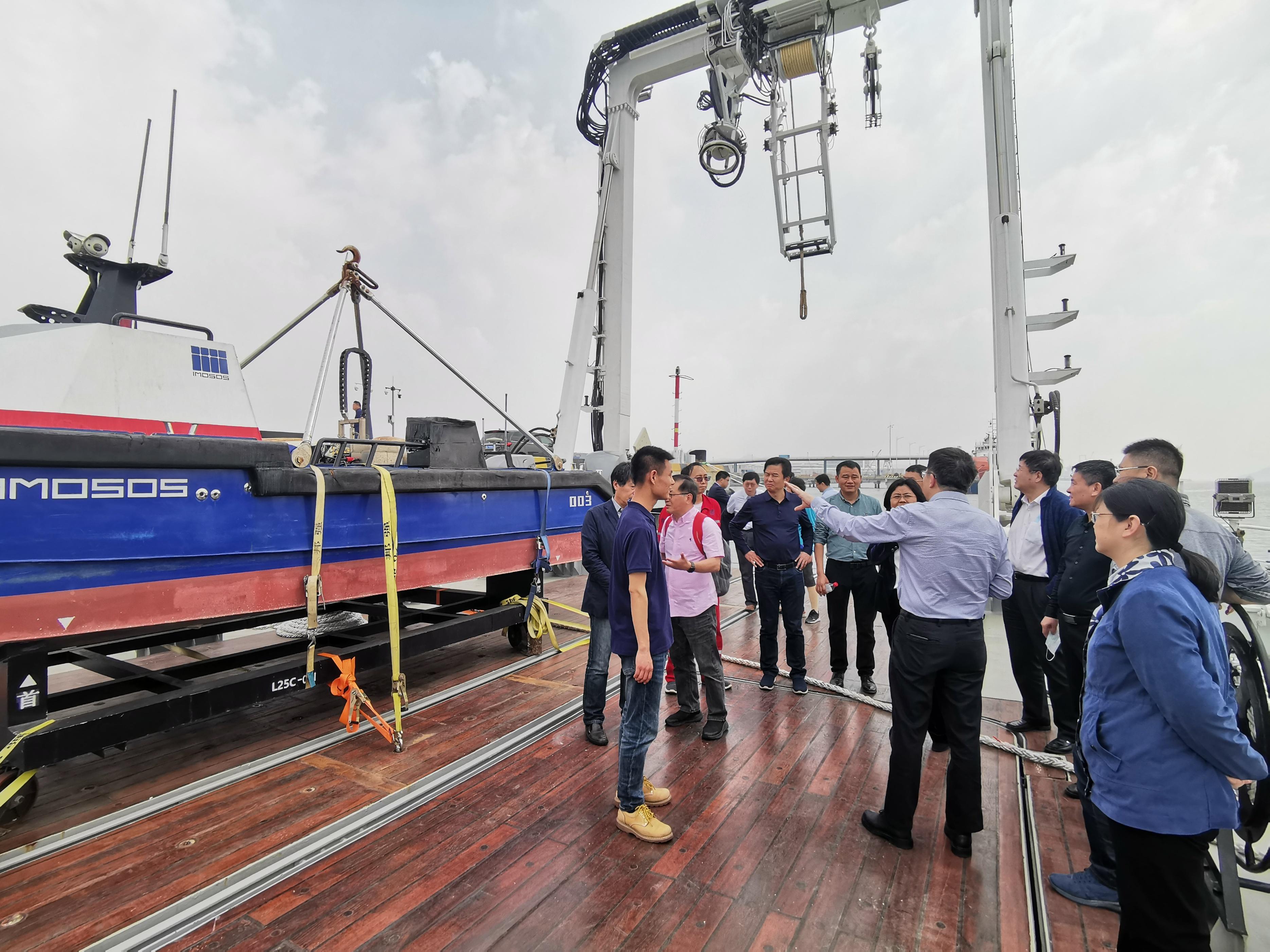 陳大可院士與專(zhuān)家們交流L25C海洋調(diào)查無(wú)人船平臺(tái)在“珠海云”上的部署及應(yīng)用。
