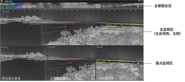 區(qū)別于視角有限的普通安防攝像頭,紅外全景雷達(dá)可實(shí)時監(jiān)測會場周邊360°全景畫面,安裝在主會場頂樓的Xsentry高清紅外全景雷達(dá)可探測到遠(yuǎn)達(dá)8km的船只,嚴(yán)禁非許可船只、無人機(jī)等進(jìn)入安保區(qū)域;在主會場周邊電信塔上的Xsentry-mini迷你紅外全景雷達(dá)則負(fù)責(zé)監(jiān)控所有靠近主會場的目標(biāo),對西北海域的船只以及1km以內(nèi)的人員、車輛進(jìn)行實(shí)時觀測,一大一小強(qiáng)強(qiáng)聯(lián)合,全方位無死角,晝夜不間斷地監(jiān)控會場周邊陸地及海域安全。
