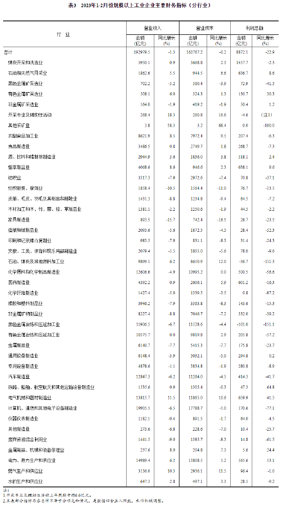 1-2月份,規(guī)模以上工業(yè)企業(yè)實(shí)現(xiàn)營業(yè)收入19.30萬億元,同比下降1.3%;發(fā)生營業(yè)成本16.38萬億元,下降0.2%;營業(yè)收入利潤率為4.60%,同比下降1.29個百分點(diǎn)。