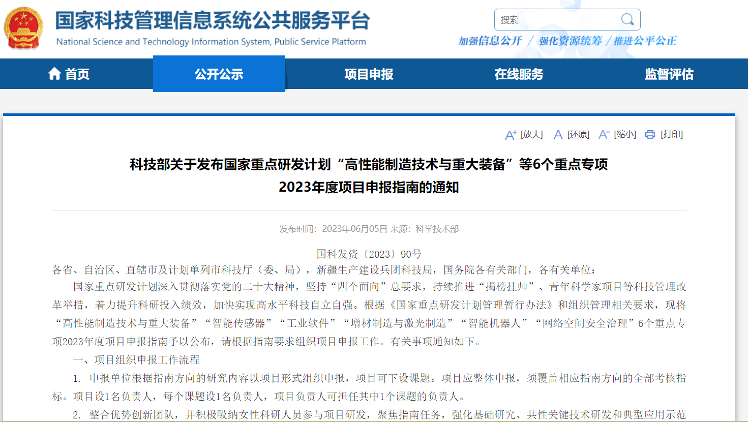 近日,科技部發(fā)布了《科技部關(guān)于發(fā)布國家重點研發(fā)計劃“高性能制造技術(shù)與重大裝備”等6個重點專項2023年度項目申報指南的通知》。