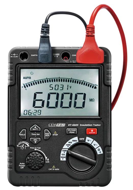 DT-6605是CEM華盛昌跟據(jù)用戶的需求研發(fā)、設(shè)計(jì)的5000V超高電壓、60GΩ超高電阻、高精度、高安全性能的一款專業(yè)高壓絕緣電阻測(cè)試儀,具有極化指數(shù)測(cè)量、自動(dòng)量程和計(jì)時(shí)測(cè)量、輸出與放電電壓指示、自動(dòng)放電電壓與輸出電壓提醒、自動(dòng)關(guān)機(jī)與電池檢測(cè)、交直流電壓測(cè)量,最大/最小值、峰值、相對(duì)值與數(shù)據(jù)保持等功能。一鍵式測(cè)量功能可自動(dòng)計(jì)算極化指數(shù)和介質(zhì)吸收之比、更好的消除計(jì)算誤差。