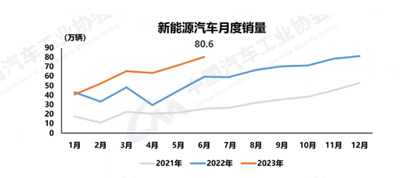 其中,新能源汽車月度銷量首次突破80萬輛,6月產(chǎn)銷分別完成78.4萬輛和80.6萬輛,同比分別增長32.8%和35.2%,市場占有率達到30.7%。