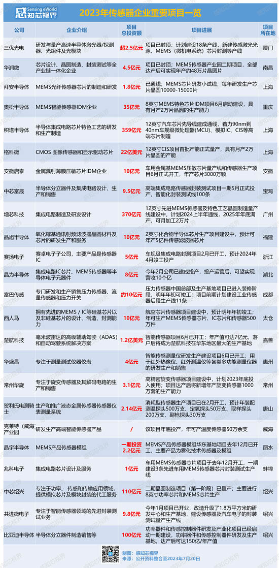 據(jù)感知芯視界不完全統(tǒng)計,目前截至2023年7月,上半年開工、建設和投產(chǎn)的傳感器項目就有24家,項目總投資額高達1230億元。