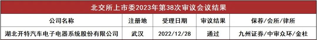 北京證券交易所上市委7月26日召開2023年第38次審議會議,審議結果顯示,湖北開特汽車電子電器系統(tǒng)股份有限公司(下稱“開特股份”)首發(fā)獲通過。
