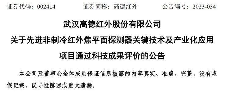 近日,高德紅外發(fā)布公告稱:湖北技術交易所在武漢組織專家對武漢高德紅外股份有限公司的“先進非制冷紅外焦平面探測器關鍵技術及產業(yè)化應用”項目進行了科技成果評價,本次成果評價由兩名院士及多位教授組成評價專家組。