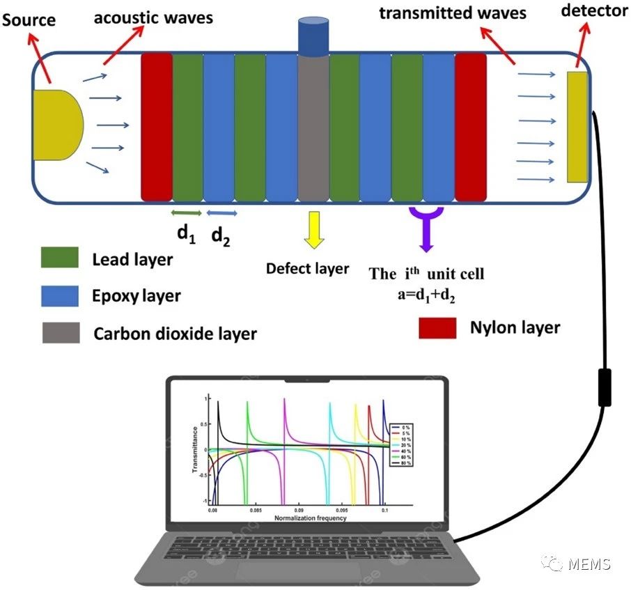 聲子晶體是一種由兩種或兩種以上的材料組成的人工周期結(jié)構(gòu)。這些材料在質(zhì)量密度、彈性特性以及聲速等方面具有差異。聲子晶體復(fù)合結(jié)構(gòu)可用于溫室氣體傳感,這是由于氣體混合物中的聲速會根據(jù)其成分而變化,因此聲子晶體可作為聲學(xué)氣體傳感器,實(shí)現(xiàn)無前置時間、低成本的傳感應(yīng)用。