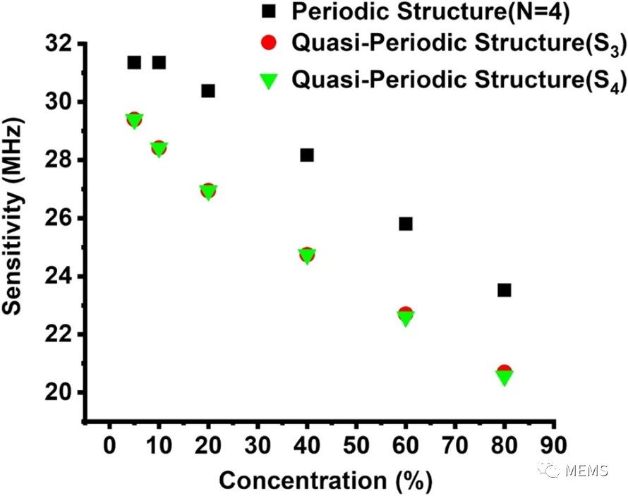 周期性和準(zhǔn)周期性(S3、S4)聲子晶體結(jié)構(gòu)對室溫下CO2氣體濃度的靈敏度