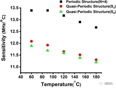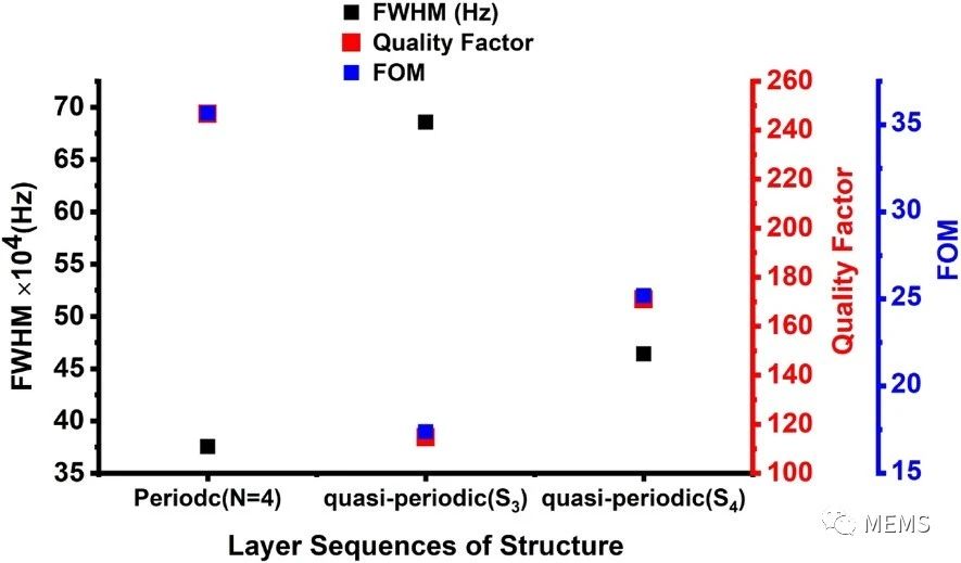 研究人員采用了兩種聲子晶體設(shè)計(jì)(周期性和斐波那契準(zhǔn)周期性),在各種濃度范圍(0 ~ 100%)和溫度范圍(0 ~ 180°C)內(nèi)檢測了周圍空氣的CO2含量。檢測過程在物理層面上取決于Fano共振模式的位移。研究人員分別驗(yàn)證了周期性和準(zhǔn)周期性(S3、S4序列)結(jié)構(gòu)傳感器的性能。結(jié)果表明,周期性聲子晶體的性能更加優(yōu)異,其靈敏度為31.5 MHz,質(zhì)量因子(Q)以及品質(zhì)因數(shù)(FOM)分別為280和95。此外,還研究了溫度對Fano共振模式位置的影響。結(jié)果表明,在0 ~ 60℃的溫度范圍內(nèi),其溫度靈敏度為13.4 MHz/°C。