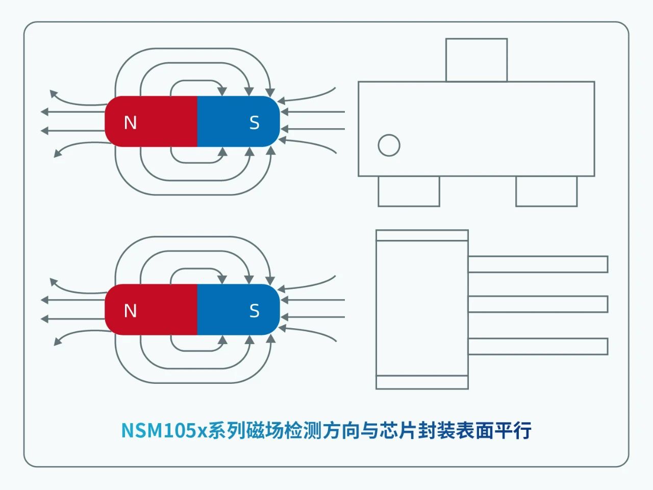 NSM105x產(chǎn)品系列包含了3個產(chǎn)品型號,即NSM1051(單極開關(guān))、NSM1052(全極開關(guān))、NSM1053(鎖存器)。通過為用戶提供不同的可選開關(guān)點(diǎn)、工作磁極、輸出相位、采樣頻率、輸出接口、封裝形式等關(guān)鍵特性,NSM105x系列可以全面覆蓋各個應(yīng)用場景下的不同系統(tǒng)需求。