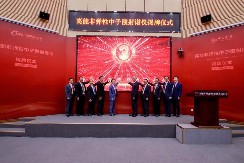 中山大學(xué)黨委書記陳春聲,中國科學(xué)院院士、中山大學(xué)校長高松和中國科學(xué)院院士、中國科學(xué)院高能物理研究所所長王貽芳等共同為“高能直接幾何非彈性中子散射飛行時間譜儀”揭牌。