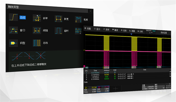 不僅在硬件性能上表現(xiàn)卓越,SDS800X HD還具有完備的軟件功能以適應更多測量場合。SDS800X HD具有豐富的觸發(fā)功能,包括邊沿、斜率、延遲、建立/保持時間和多種總線觸發(fā)(串行觸發(fā))。支持嵌入式行業(yè)的I2C、SPI、UART協(xié)議及汽車行業(yè)的CAN、LIN協(xié)議的觸發(fā)與解碼,能夠準確捕獲并直觀地將總線的協(xié)議信息以表格形式或其它方式顯示,穩(wěn)定進行測試。