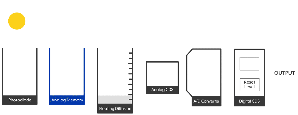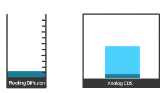 上圖顯示了索尼CMOS滾動(dòng)快門(mén)圖像傳感器傳統(tǒng)像素的工作流程。光電轉(zhuǎn)換(用量子效率測(cè)量)發(fā)生在光電二極管中,電子在浮動(dòng)擴(kuò)散節(jié)點(diǎn)轉(zhuǎn)換為電壓(電壓是電荷(q)除以電容(C)),之后電信號(hào)被轉(zhuǎn)換成數(shù)字信號(hào)。在這一階段,信號(hào)經(jīng)過(guò)2級(jí)相關(guān)雙采樣(CDS)來(lái)減少模擬和數(shù)字噪聲,這個(gè)過(guò)程被稱(chēng)為“雙cd”,是索尼為了減少隨機(jī)和固定模式噪聲的解決方案。