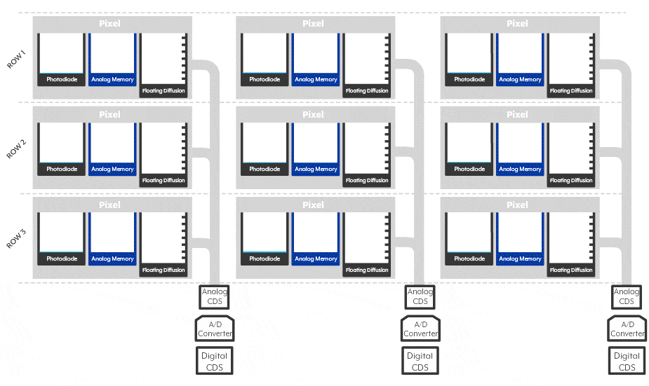 為了將全局快門(mén)技術(shù)應(yīng)用到索尼的CMOS傳感器中,索尼在光電二極管和浮動(dòng)擴(kuò)散節(jié)點(diǎn)之間創(chuàng)建了一個(gè)新的像素模擬存儲(chǔ)節(jié)點(diǎn)。在Pregius CMOS傳感器中,所有光電二極管同時(shí)開(kāi)始曝光,當(dāng)光電二極管完全曝光時(shí),電子流入模擬存儲(chǔ)器并釋放光電二極管進(jìn)行下一次的曝光。電荷轉(zhuǎn)移到模擬存儲(chǔ)器后,轉(zhuǎn)換過(guò)程與卷簾門(mén)傳感器相同。最終結(jié)果是一個(gè)全局快門(mén)CMOS傳感器捕捉非失真圖像,同時(shí)利用雙CDS技術(shù)來(lái)減少隨機(jī)和固定模式噪聲。