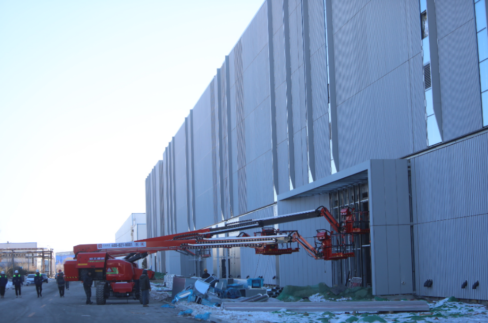 朝陽給一棟棟改造中的廠房鍍上金色,也照亮了五百余位施工人員忙碌的身影。吊車吊起大塊的玻璃、水泥板,施工人員通過直臂車被送至高處,將玻璃、水泥板呈百葉窗狀交替安裝至外墻。曾經(jīng)的福田汽車老舊廠房在他們的手中悄然變了模樣,外觀看起來時尚現(xiàn)代,透著大氣和科技感。