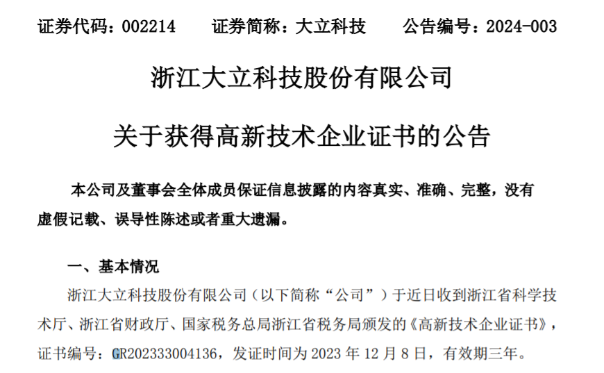 據(jù)悉,大立科技這次高新技術(shù)企業(yè)的認(rèn)定系原高新技術(shù)企業(yè)證書有效期滿后的重新認(rèn)定。