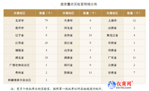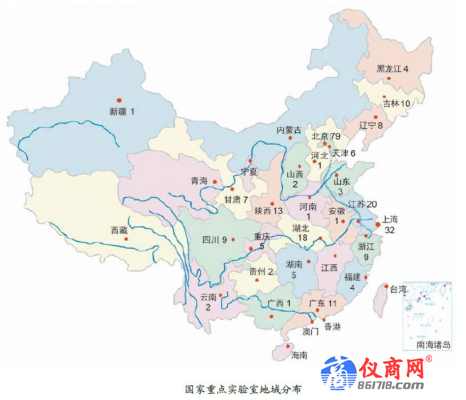 國(guó)家重點(diǎn)實(shí)驗(yàn)室分布在全國(guó)25個(gè)省、自治區(qū)和直轄市,其中北京市79個(gè),上海市32個(gè),江蘇省20個(gè),湖北省18個(gè),陜西省13個(gè),基本反映了我國(guó)基礎(chǔ)研究力量的地域分布。