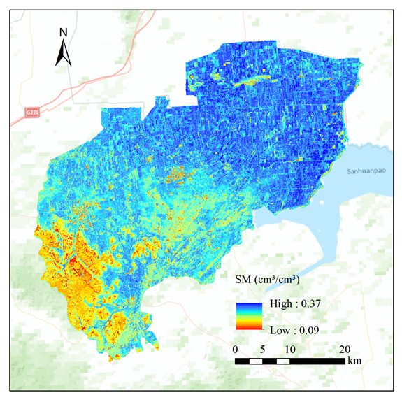 圖:寬幅熱紅外成像儀獲取黑龍江雙鴨山市友誼縣農(nóng)田區(qū)土壤水分反演結(jié)果,通過植被指數(shù)和地表溫度,構(gòu)造干濕邊方程,計(jì)算得到植被干旱指數(shù)。