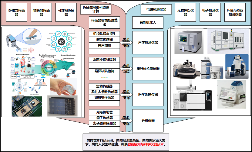 感知系旨在智能傳感與科學(xué)儀器的融合發(fā)展,通過(guò)基礎(chǔ)前沿傳感器的突破,實(shí)現(xiàn)分析儀器、醫(yī)學(xué)診斷儀器、物化性能檢測(cè)儀器、無(wú)損檢測(cè)儀器等高端科學(xué)儀器研制及性能提升。主要研究方向包括: