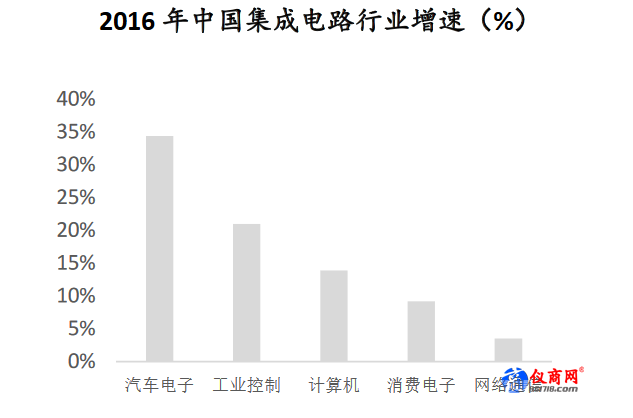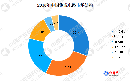 21世紀(jì)以來(lái),我國(guó)依托下游廣闊的市場(chǎng),芯片行業(yè)得以迅速發(fā)展。2016年我國(guó)集成電路行業(yè)市場(chǎng)規(guī)模達(dá)11985.9億元,同比增長(zhǎng)8.7%,規(guī)模及增速均繼續(xù)領(lǐng)跑全球。從結(jié)構(gòu)上看,網(wǎng)絡(luò)通信、計(jì)算機(jī)和消費(fèi)電子依然是國(guó)內(nèi)集成電路占比最高的領(lǐng)域,三者占比之和超過(guò)75%。從增速上看,汽車(chē)電子和工業(yè)控制領(lǐng)域是增速最快的領(lǐng)域,汽車(chē)電子的增速達(dá)到34.4%。