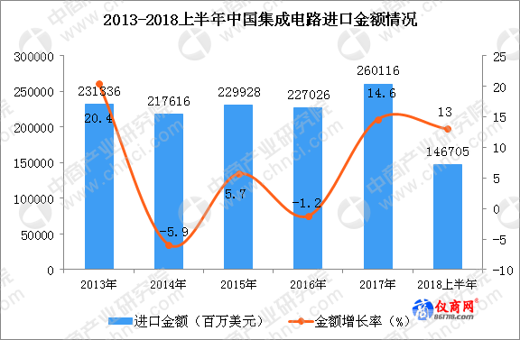 但總體來(lái)看,我國(guó)集成電路產(chǎn)業(yè)總體處在發(fā)展初期,集成電路自給率僅為三成,進(jìn)口額高居不下。據(jù)海關(guān)總署數(shù)據(jù),2017年我國(guó)集成電路進(jìn)口金額明顯增長(zhǎng),2017年我國(guó)集成電路進(jìn)口金額為260116億元,同比增長(zhǎng)14.6%。2018年上半年我國(guó)集成電路進(jìn)口金額為146705百萬(wàn)美元,同比增長(zhǎng)13%。國(guó)產(chǎn)替代將是十三五規(guī)劃國(guó)家重中之重的要大力發(fā)展和攻堅(jiān)的項(xiàng)目。當(dāng)前集成電路國(guó)產(chǎn)化需求強(qiáng)烈,進(jìn)口替代空間大。