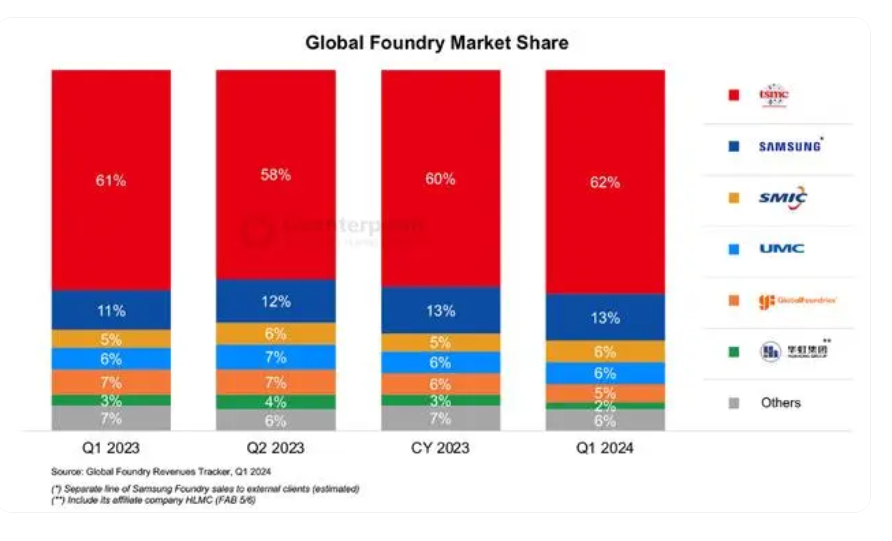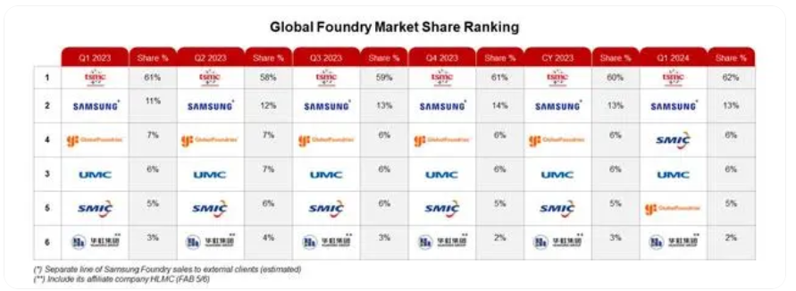 這使得中芯國際僅次于臺積電和三星電子——這兩家公司在第一季度的市場份額分別為62%和13%。