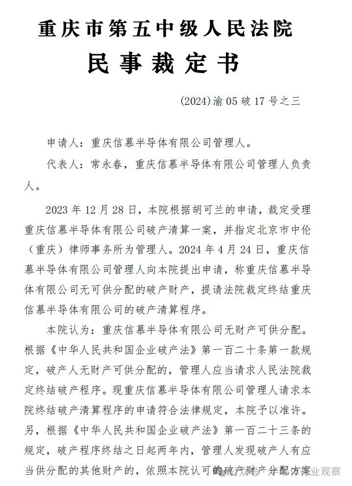 2023年 12月 28日,重慶市第五中級人民法院根據(jù)胡可蘭的申請,裁定受理重慶信慕半導(dǎo)體有限公司破產(chǎn)清算一案,并指定北京市中倫(重慶)律師事務(wù)所為管理人。2024年 4月 24日,重慶信慕半導(dǎo)體有限公司管理人向本院提出申請,稱重慶信慕半導(dǎo)體有限公司無可供分配的破產(chǎn)財(cái)產(chǎn),提請法院裁定終結(jié)重慶信慕半導(dǎo)體有限公司的破產(chǎn)清算程序。