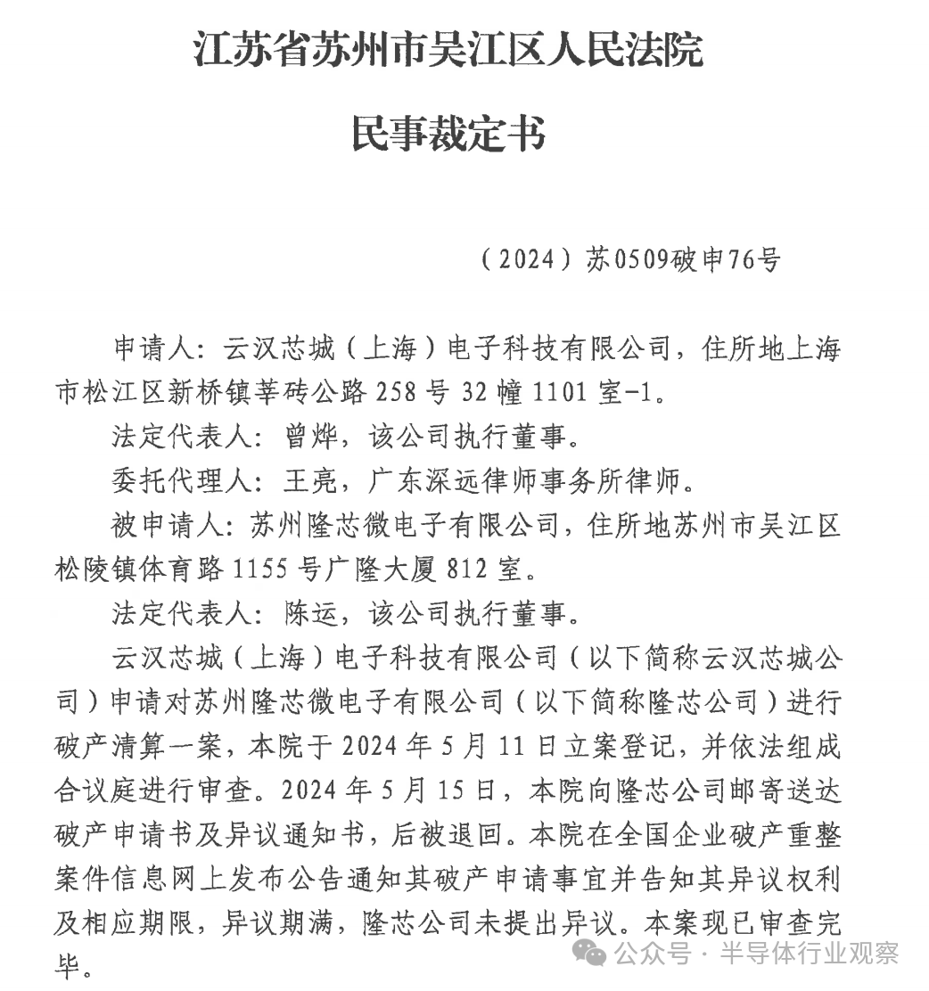 2024年6月7日,江蘇省蘇州市吳江區(qū)人民法院裁定蘇州隆芯微電子有限公司破產(chǎn)清算,隆芯公司成立于2016年1月12日。企查查信息顯示,蘇州隆芯微電子有限公司生產(chǎn)各種創(chuàng)新產(chǎn)品,包括數(shù)據(jù)轉(zhuǎn)換器,放大器和線性產(chǎn)品,射頻(RF)IC,電源管理產(chǎn)品,基于微機(jī)電系統(tǒng)(MEMS)技術(shù)的傳感器,其他類型傳感器以及信號處理產(chǎn)品,包括DSP和其他處理器。