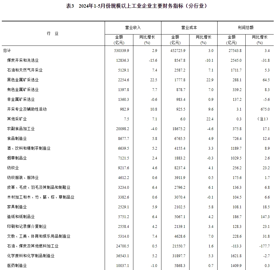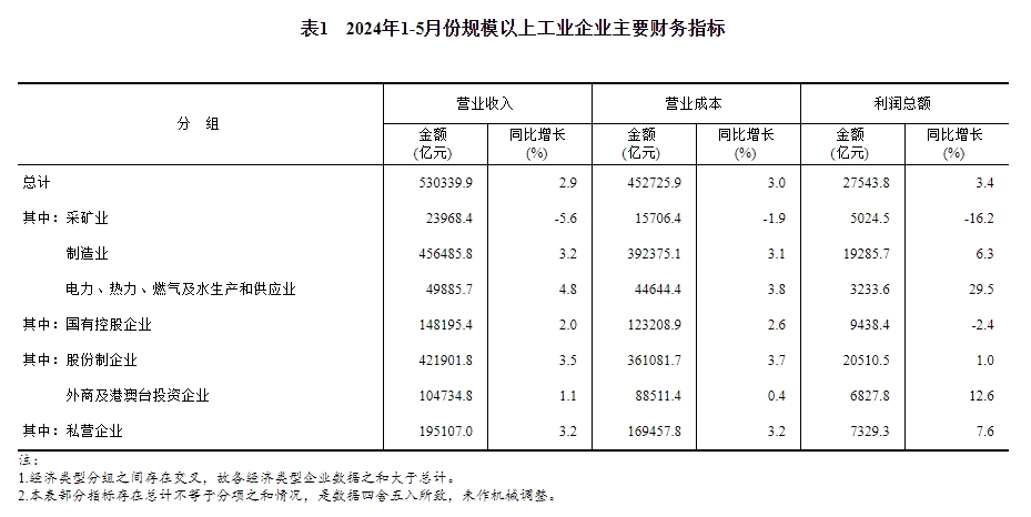 1—5月份,全國規(guī)模以上工業(yè)企業(yè)實(shí)現(xiàn)利潤總額27543.8億元,同比增長3.4%。