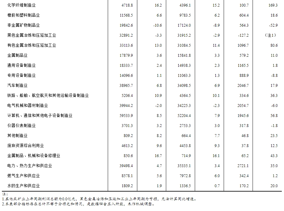 1—5月份,主要行業(yè)利潤情況如下:有色金屬冶煉和壓延加工業(yè)利潤同比增長80.6%,計(jì)算機(jī)、通信和其他電子設(shè)備制造業(yè)增長56.8%,電力、熱力生產(chǎn)和供應(yīng)業(yè)增長35.0%,紡織業(yè)增長23.2%,汽車制造業(yè)增長17.9%,農(nóng)副食品加工業(yè)增長17.1%,石油和天然氣開采業(yè)增長5.3%,通用設(shè)備制造業(yè)增長1.8%,化學(xué)原料和化學(xué)制品制造業(yè)下降2.7%,電氣機(jī)械和器材制造業(yè)下降6.0%,專用設(shè)備制造業(yè)下降8.8%,煤炭開采和洗選業(yè)下降31.8%,非金屬礦物制品業(yè)下降52.9%,石油煤炭及其他燃料加工業(yè)由盈轉(zhuǎn)虧,黑色金屬冶煉和壓延加工業(yè)虧損增加。