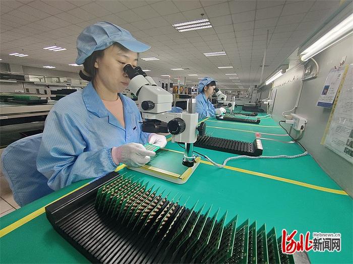 7月19日,在河北遠(yuǎn)東通信系統(tǒng)工程有限公司,工作人員在檢測(cè)恒溫晶振貼裝電路板。 河北日?qǐng)?bào)記者 李暢攝