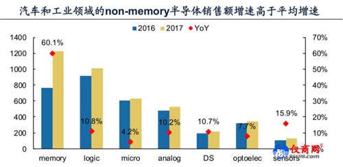 根據(jù)SIA的數(shù)據(jù),2017年除存儲器外的半導(dǎo)體銷售額增速為9%,而應(yīng)用于汽車、工業(yè)領(lǐng)域的non-memory半導(dǎo)體月度銷售額同比增速均在10%以上,遠(yuǎn)遠(yuǎn)高于全球半導(dǎo)體銷售額的整體增速,可見汽車和工業(yè)正在成為全球半導(dǎo)體高成長的下游應(yīng)用領(lǐng)域。以汽車為例,隨著電動化和智能化的提升,單部汽車對半導(dǎo)體的需求正在逐步提升,比如單部電動車Tesla Mobel X中 的半導(dǎo)體約需要一塊8寸晶圓。根據(jù)strategy analytics的數(shù)據(jù),單部汽車中半導(dǎo)體價值量從2016年的317美元提升至2017年的330美元,同比增速達(dá) 4.1%。