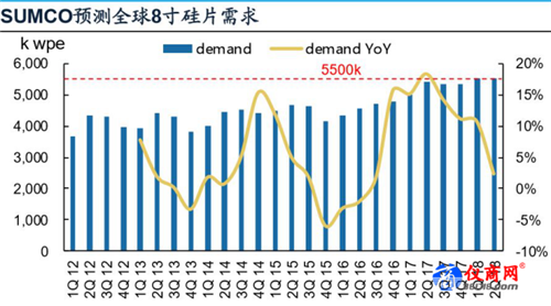 需求方面:根據(jù)SUMCO在2018Q1業(yè)績說明會上的指引,2018Q1全球8寸晶圓 需求約為5.5 M / wpe,我們認(rèn)為這是SUMCO通過下游晶圓廠所觀察到的需求,由 于當(dāng)前8寸晶圓產(chǎn)能緊缺,下游最終端的需求并未完全反映在該數(shù)字中,實際全球?qū)?8寸晶圓產(chǎn)能的需求高于5.5M / wpe。