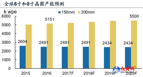 而2016年以后6寸晶圓產(chǎn)能相對穩(wěn)定并呈小幅下降趨勢,預(yù)計2019年產(chǎn)能小幅 下降57 k wpe,折算為8寸片為32 k wpe,因此6寸晶圓產(chǎn)能的減小使得對8寸晶圓產(chǎn) 能需求小幅度上升。