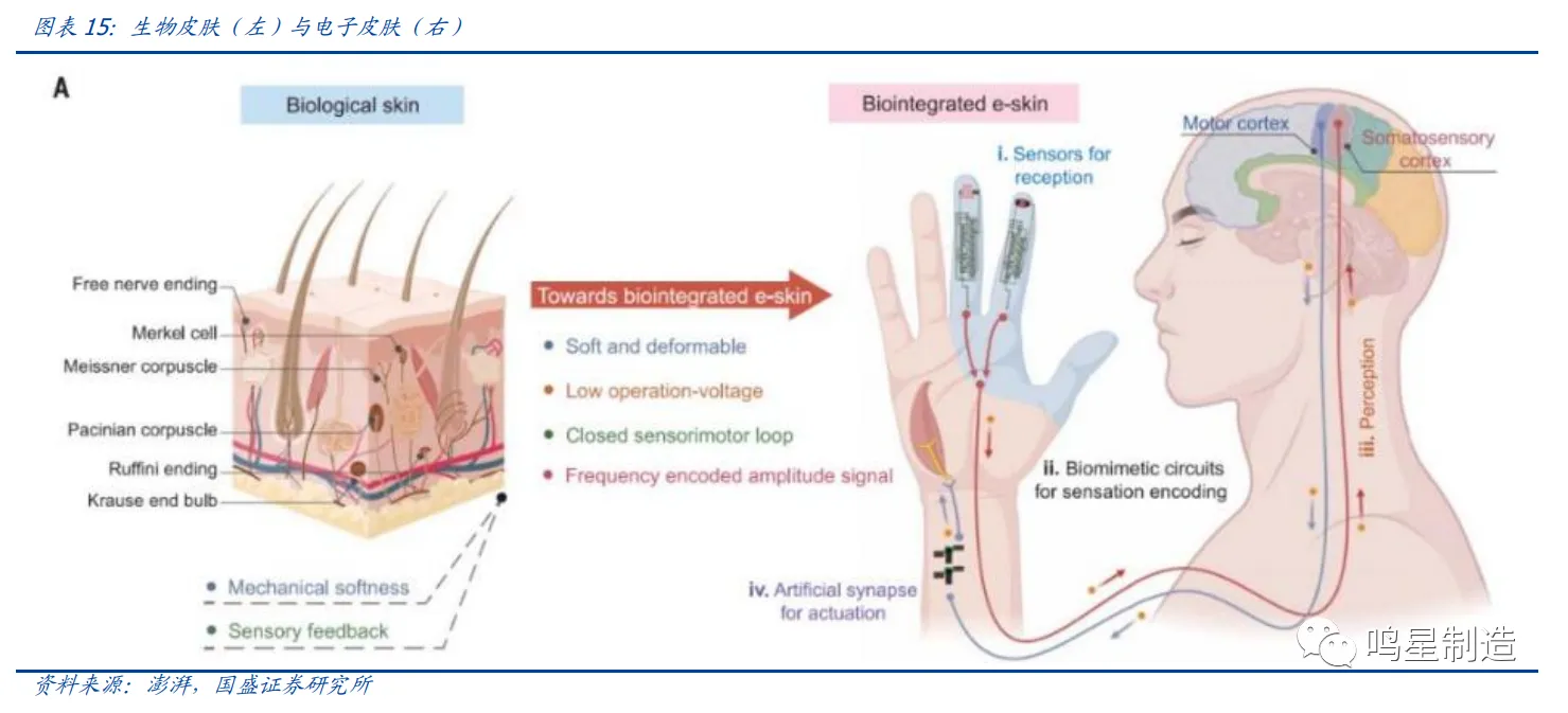 同時(shí),機(jī)器人若要模擬人體的觸覺,以及實(shí)現(xiàn)人體皮膚對溫度、濕度等外界物理量的感知,則電子皮膚可能是最佳路徑之一。電子皮膚需要集成各類傳感器和集成電路,并使用柔性的材料制作,壁壘較高,目前尚未在機(jī)器人領(lǐng)域大量應(yīng)用。但從泛用性與仿生性角度,我們認(rèn)為電子皮膚或是機(jī)器人觸覺的終極方案。