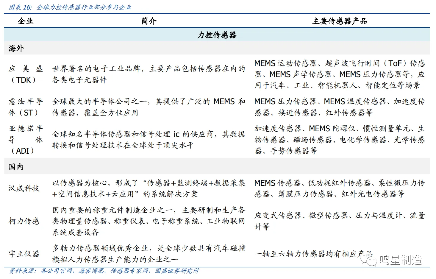 力控傳感器領(lǐng)域,國內(nèi)尚未出現(xiàn)絕對龍頭,未來機(jī)器人有望帶來大量需求,推動(dòng)國內(nèi)企業(yè)快速發(fā)展。在力控傳感器領(lǐng)域,國內(nèi)企業(yè)與海外龍頭差距較大,海外相關(guān)企業(yè)多為電子元器件綜合供應(yīng)商,而國內(nèi)企業(yè)尚未出現(xiàn)類似于視覺領(lǐng)域的絕對龍頭。我們認(rèn)為,機(jī)器人有望帶來大量力控傳感器需求,國內(nèi)相關(guān)企業(yè)有望持續(xù)受益。