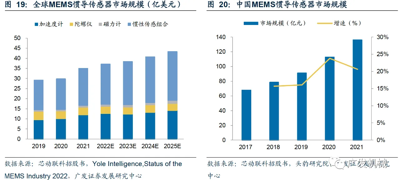 全球MEMS慣性導(dǎo)航傳感器市場規(guī)模超230億,中國市場超100億。據(jù)芯動(dòng)聯(lián)科招股 書援引Yole發(fā)布的Status of MEMS Industry 2022中的數(shù)據(jù), 2021年全球MEMS慣導(dǎo) 傳感器市場規(guī)模約35.09億元。據(jù)芯動(dòng)聯(lián)科招股書援引的頭豹研究院數(shù)據(jù),2021年中 國MEMS慣導(dǎo)傳感器市場規(guī)模約136億元,增速約為20.63%。