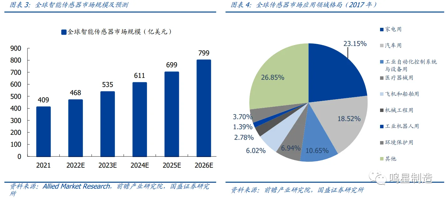 市場空間將逾500億美元,家電+汽車+工控是智能傳感器的主要應(yīng)用領(lǐng)域。根據(jù)Allied Market Research的預(yù)測,2020-2026年,全球智能傳感器市場規(guī)模年均增速有望超過14%,預(yù)計(jì)到2026年,全球智能傳感器市場規(guī)模接近800億美元。從具體的下游分別看,智能傳感器主要聚焦在消費(fèi)類產(chǎn)品和工業(yè)類產(chǎn)品,2017年家電和汽車分別占比達(dá)到23.15%和18.52%,占主要部分。此外,工控、醫(yī)療、飛機(jī)和船舶等領(lǐng)域?qū)χ悄軅鞲衅鞯氖褂昧恳草^為普遍。